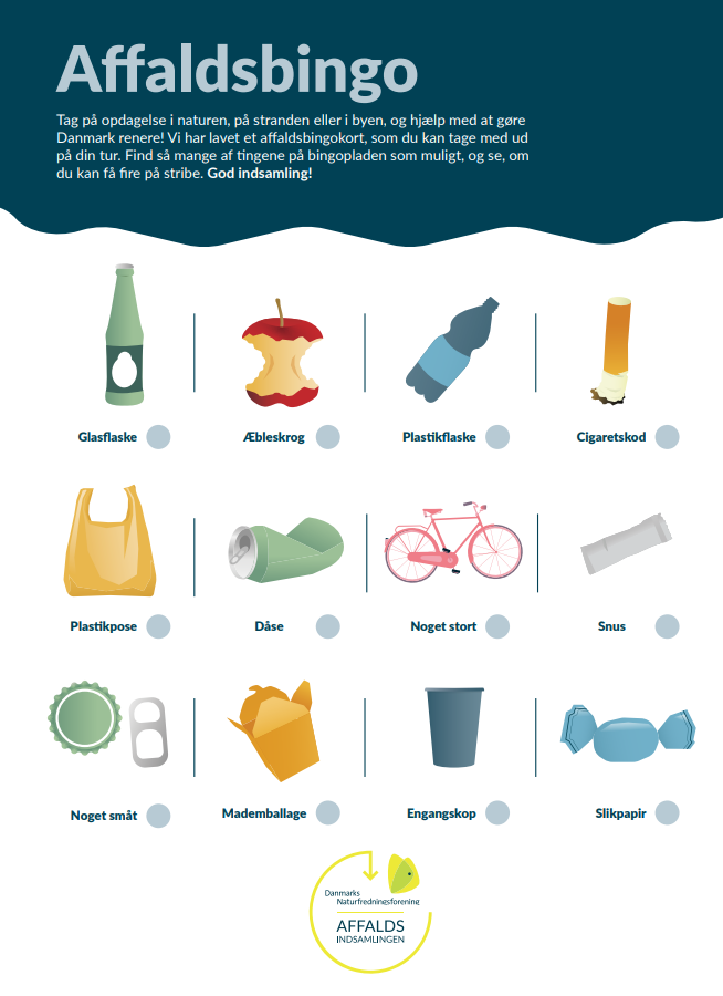 Gør affaldsjagt til en sjov og lærerig oplevelse med Affaldsbingo! Denne bingoplade hjælper jer med at kombinere leg og læring, mens børnene får kendskab til forskellige typer affald i naturen. Med bingopladen i hånden skal de finde og krydse forskelligt affald af – alt fra plastik og glas til organisk affald. God fornøjelse!