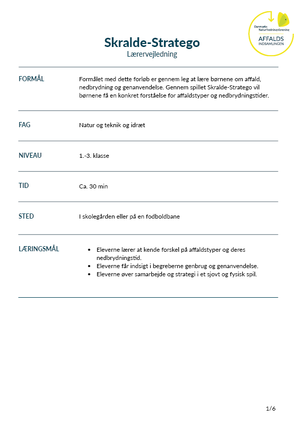 Skralde-Stratego gør det sjovt og aktivt at lære om affald og genanvendelse. Materialet giver jer et spil, hvor børnene får en forståelse for affaldstyper og nedbrydningstider, samtidig med at de øver samarbejde og strategisk tænkning – perfekt til en dag med både læring og leg i skolegården. Rigtig god fornøjelse med spillet!