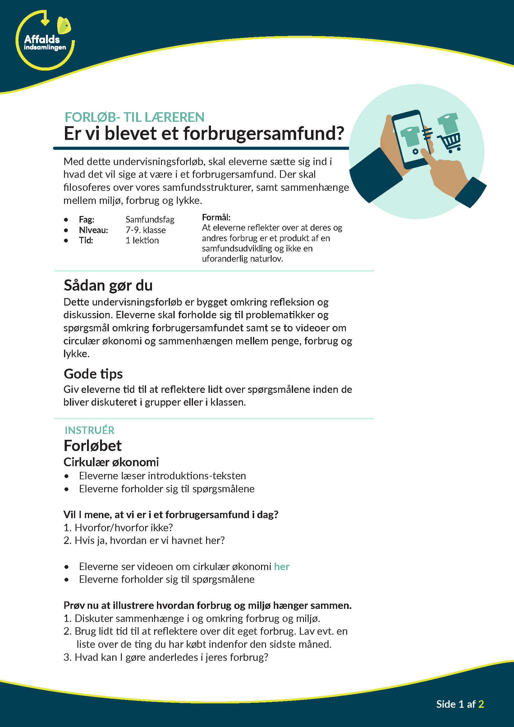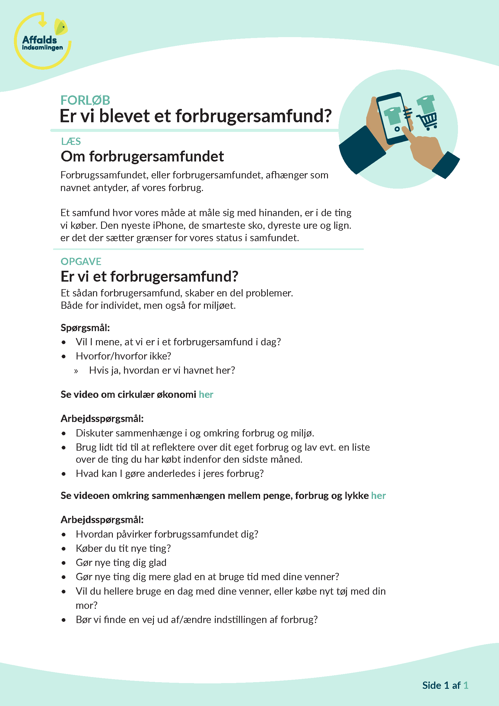 Dette undervisningsforløb er bygget omkring refleksion og diskussion. Eleverne skal forholde sig til problematikker og spørgsmål omkring forbrugersamfundet samt se to videoer om circulær økonomi og sammenhængen mellem penge, forbrug og lykke.