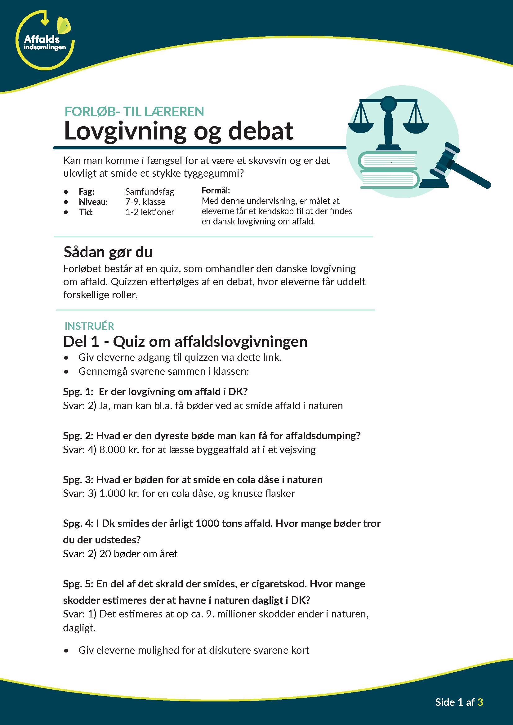Med denne undervisning, er målet at eleverne får et kendskab til at der findes en dansk lovgivning om affald.